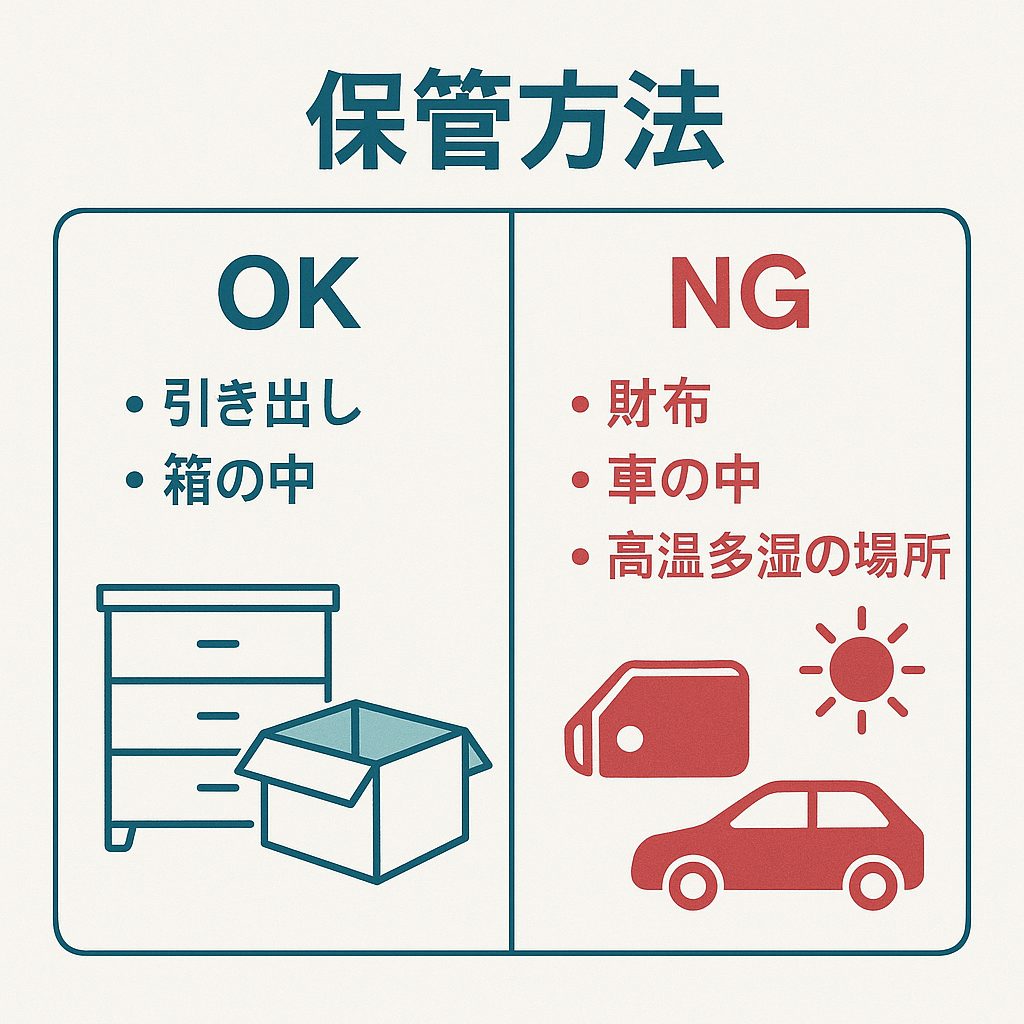 • NG行動:車内放置、財布保管、期限切れの使用